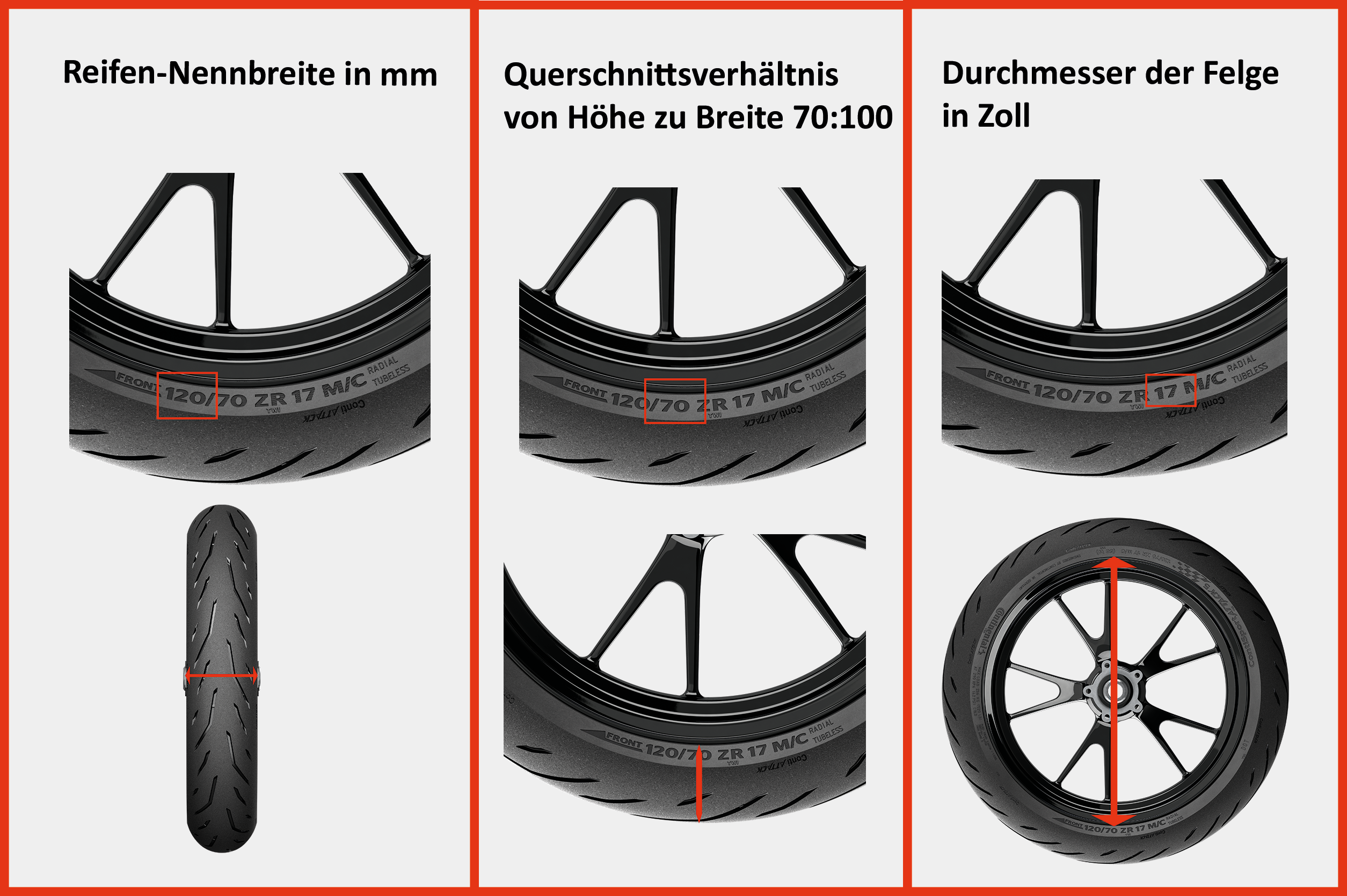 Ein Reifen mit der Bezeichnung 120/70-17 weist folgende Merkmale auf: